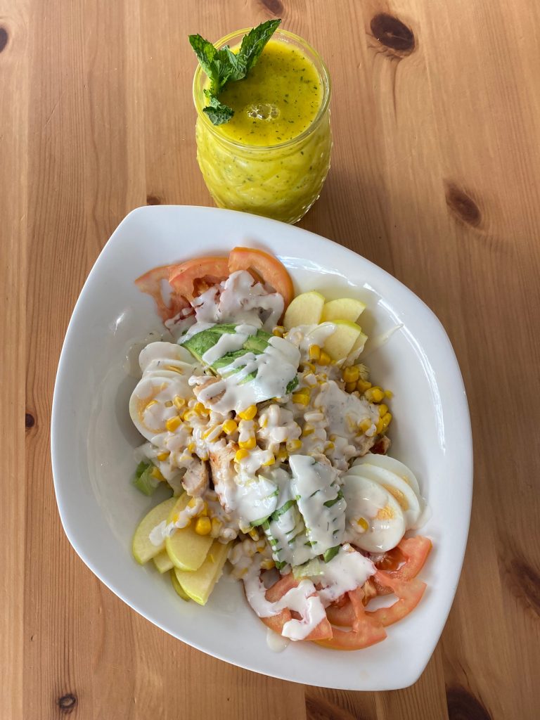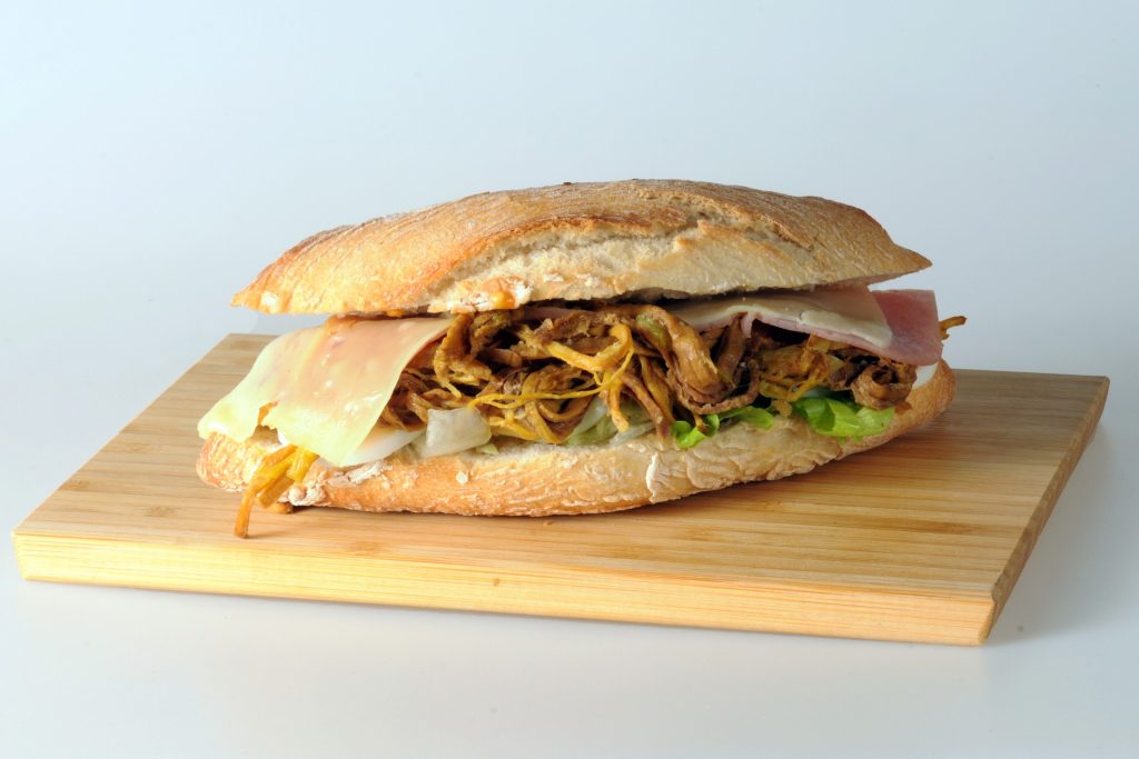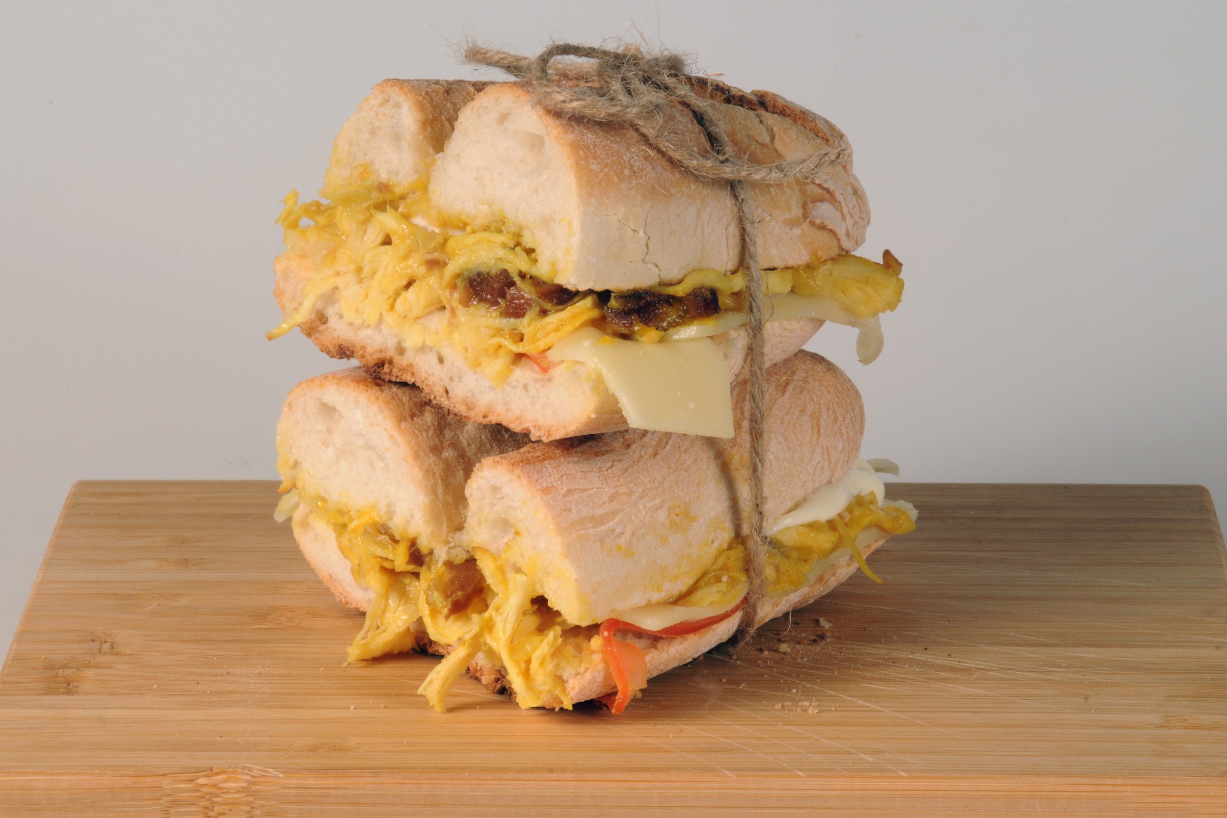 Pollo mechado, queso semicurado, dátiles, mostaza y mahonesa.